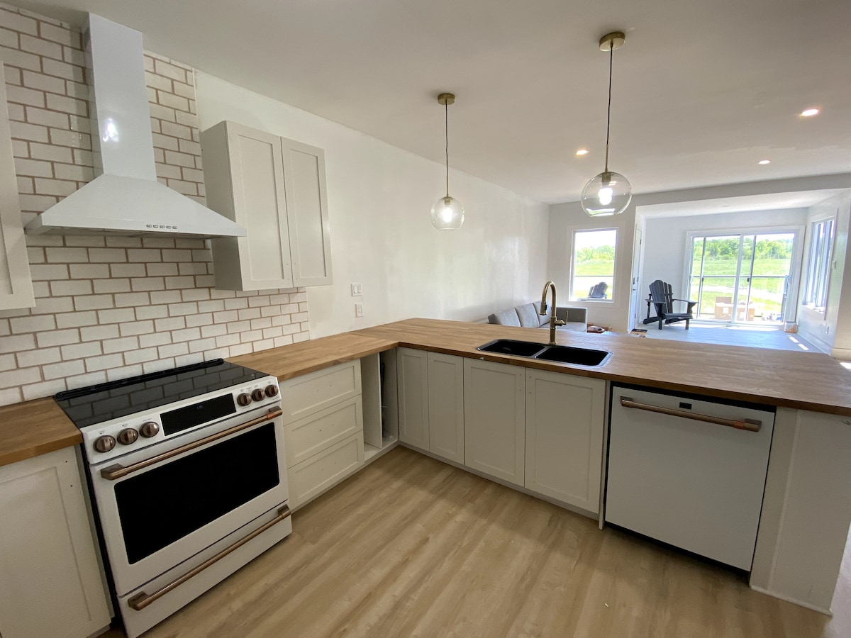 Getaway at our stylish and open concept airbnb just steps from the Rideau River. Our Airbnb boasts views of the Rideau locks from the front, and of our 6 acre property from the back. Take our canoe or paddle boards out on the river, enjoy a campfire under the stars, hike the nearby trails, or go exploring in the nearby town of Merrickville. Enjoy your own private courtyard with dining table, BBQ, and lots of privacy.
