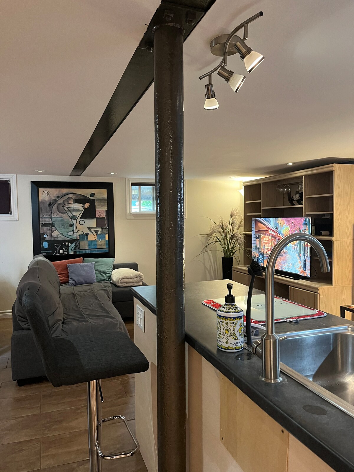 Welcome to New Toronto! Driveway parking included next to entrance. Large -Cozy basement apartment in lakeshore village, Lake Ontario is at the end of the street. Beautiful skyline view of downtown Toronto , Full kitchen with stove and oven. Large dining room table. Comfortable L- shaped couch. One bedroom with queen size bed. Washer , dryer, laundry facility. WiFi Netflix, Prime video, Book a month or longer stays , bring your pet.