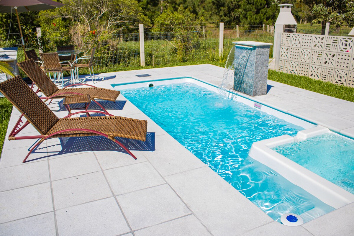 Relaxe neste espaço calmo e cheio de estilo. curta o som dos pássaros e aproveite a natureza. localizado na região de Torres-RS Piscina com aquecimento solar e espaço gourmet para o lazer. 1,8km da praia da Itapeva e 15 minutos do centro de Torres. Uma ampla sacada faz um convite para você contemplar o nascer-do-sol. Patio cercado , churrasqueira de espeto , estrada para chegar e de cascalho , como a casa é em meio a natureza pode ter alguns animais ,