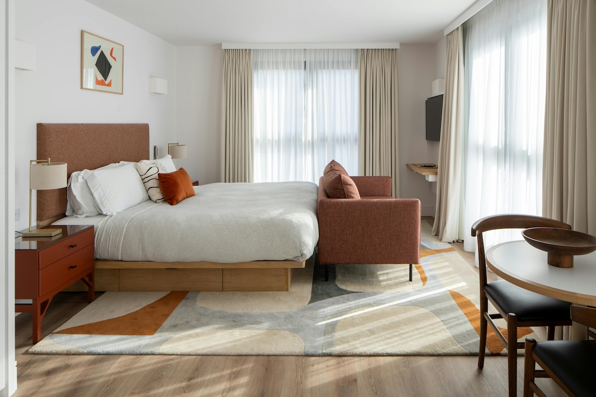 Step into the neo studio where bright and modern design creates the perfect city retreat unwind on a king size bed with LED mood lighting and complimentary coffee and croissant each morning enjoy the convenience of a kitchenette with a microwave and refrigerator plus air conditioning and USB charging points for total comfort after a day of exploring relax with fast free WiFi a heated bathroom floor and all the essentials you need for a stylish and cozy stay.