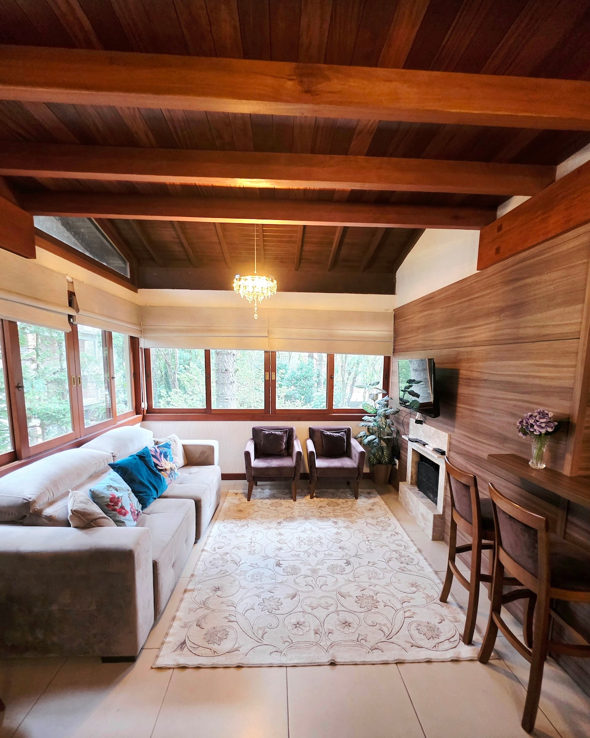 ✨ Flat/Suíte de Alto Padrão no Laje de Pedra – Canela/RS Aconchegante flat para até 5 pessoas, com quarto de casal, sala ampla com dois ambientes, lareira, sofá-cama, recamier e mesa de jantar. Cozinha completa. Banheiro com duas cubas e banheira de hidromassagem. 🌲 Localizado no Mountain Village, dentro do icônico Condomínio Laje de Pedra, com linda vista para um bosque de araucárias. Um refúgio de conforto, charme e natureza na Serra Gaúcha.