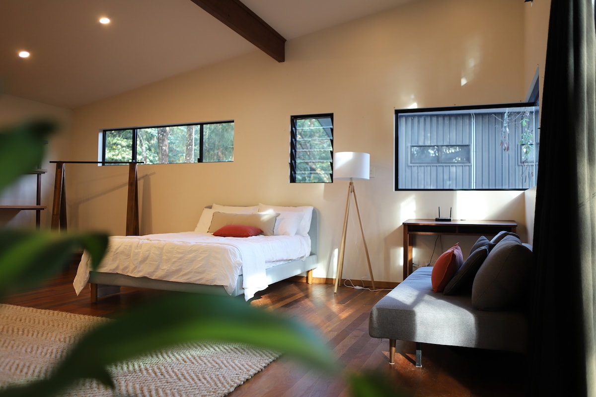 The Barefoot Bungalow @ Pottsville is a modern and stylish, detached 2 room flat that sits quietly amongst a spacious and landscaped backyard. The cosy flat has 1 king bed and 1 single/king day bed, lounge & TV area, kitchenette and a generous bathroom. A covered outdoor deck with seating and a BBQ for your use too. Only 200m from the pristine Pottsville Beach. Perfect for a couples retreat, weekend away with friends, work stay or family holiday!