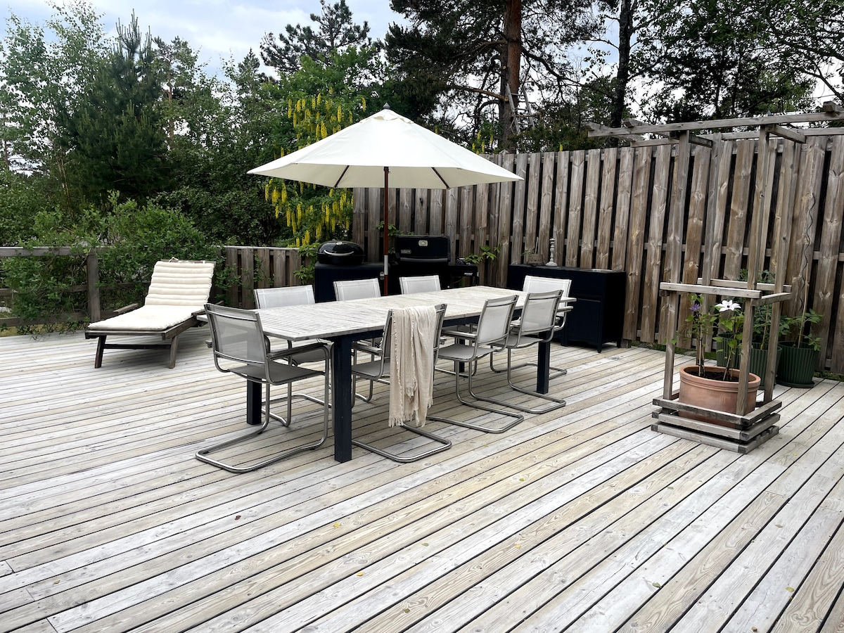 Charming 130-year-old cottage (90 m²) with a modern yet cosy feel. Two renowned spas (Yasuragi & Skepparholmen) within walking distance. Bottom floor: kitchen and dining area with classic wood stove, living room and bathroom. Your own garden and spacious wooden deck—perfect for sunbathing or BBQs. Set in a beautiful area with a crystal-clear lake for bathing just 200 m away, with a nature reserve surrounding it. Sea dock ~700 m. 30 minutes to Stockholm by Waxholm boat, bus or car.