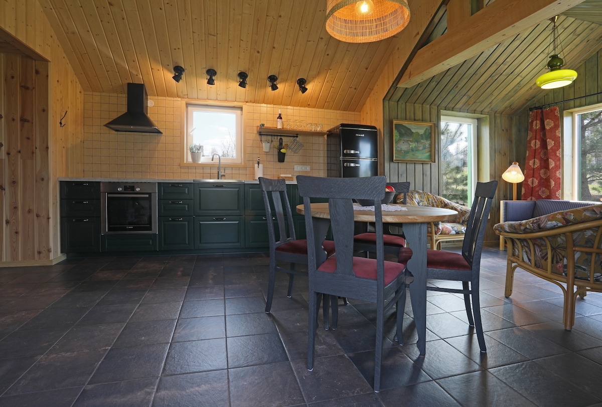 Mūsu kajīte Žvejo namelis - lieliska vieta draugu, ģimeņu vai pāru grupai, kas novērtē dabas mieru, apbrīno ekoloģisko dzīvesveidu un vēlas pavadīt kādu laiku dabas ielokā. Kabīne ir mājīga, silta, tradicionāla Lietuvas lauku guļbūve (studija ar bēniņiem) ar nelielu virtuvi, vannas istabu/dušu, kamīnu un dīvāngulta. Mājas bēniņos ir viens divvietīgs un divi vienvietīgi matrači. Mājai ir plaša terase, kas savienota ar gājēju tiltu uz ezeru.