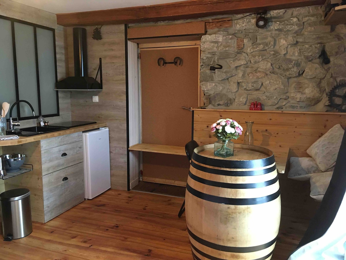 Atpūtieties šajā mīkstajā un klusajā naktsmītnē dabas pakājē. Studija tipiskā lauku mājā, kas renovēta 2022. gadā no 1850. gadā. Saulains, bet labi izolēts, jo sienas ir biezas, tāpēc interjers ir vēss, ar panorāmas skatu uz laukiem, augļu dārziem un apkārtējiem kalniem. Mini virtuve aprīkota ar aprīkojumu, parketa grīdu, atklātām sijām, dīvāngultu, kumodi, galdu un krēsliem. Droša telpa velosipēdiem vai citiem priekšmetiem, ārējais krāns. Neobligāta uzkopšana pēc pieprasījuma: 40 eiro