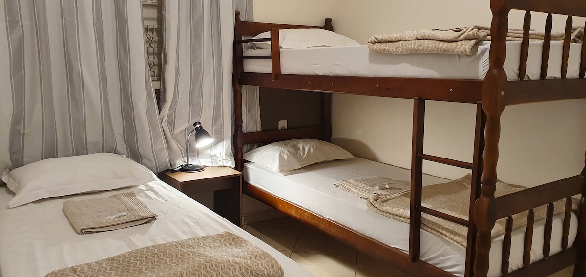 Esta acomodação conta 1 cama de solteiro e uma beliche , ar-condicionado, frigobar, tv multimidia com netflix, wi-fi e cabeado , mesa de trabalho, enxoval completo. O café da manhã não está incluso no valor da diária é opcional a partir de R$ 20,00 . O wc. fica na frente da acomodação é uso individual porem compartilhado com mais um apto. igual a este. é trancado com chave somente uso para os hospedes destes dois apartamentos.