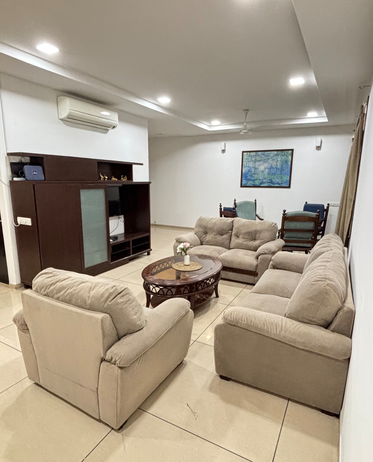 Mēs uzņemam tikai ģimenes. Pilnībā mēbelēts dzīvoklis slēgtā kopienā ar divām guļamistabām, lielu ģimenes istabu ar atvērtu terasi, ēdamistabas zonu un pilnībā aprīkotu virtuvi. Divas pilnas vannasistabas, viena pievienota un viena kopīga, abas ar tekošu karstu un aukstu ūdeni. Abas guļamistabas, kā arī viesistaba ir aprīkota ar maiņstrāvu. Virtuve aprīkota ar ledusskapi, RO dzeramajam ūdenim, mikroviļņu krāsni, indukcijas plīts virsmu, traukiem, galda piederumiem, traukiem utt. un veļas mašīnu mazgāšanas zonā. 43collu televizors dzīvojamajā zonā.