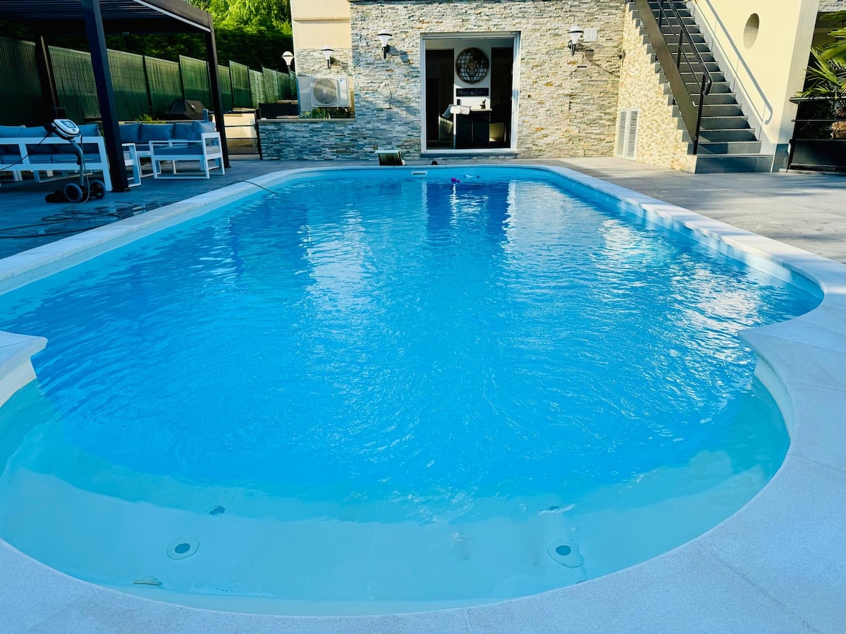 Naktsmītne ar gaisa kondicionētāju, 5 istabas, guļvietas 8 personām, virtuve, terases, Dzīvojamā istaba ar dīvāngultu, 3 guļamistabas ar studijas tipa dzīvokli, 3 wc un 3 dušas telpas Atpūtas telpa ar saunu un sešvietīgu burbuļvannu, tās terases atpūtas telpa. Spēļu istaba, galda futbols, pinball, šautriņas un ARCADE terminālis, galda spēles 2 elektriskie velosipēdi, pingponga galds Apsildāms baseins no 05/01 līdz 09/30, dzīvojamā istaba, pergola, sauļošanās. Terase ar 10/12 galda piederumu galdiņu, nojumi, gāzes grilu Izmitināšana ar tiešu piekļuvi baseinam