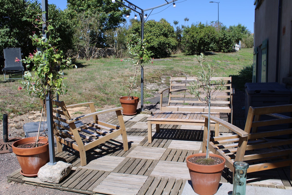 Gîte indépendant avec terrasse dans une villa familiale, environnement nature ! Les sentiers au départ du gîte offrent de beaux panoramas sur les monts et vignobles du Mâconnais ; si vous le souhaitez, poursuivez votre randonnée jusqu'aux châteaux de Berzé et de Pierreclos. Découvrez l'histoire des moines du Moyen Âge à l'abbaye de Cluny, grimpez en haut de la roche de Solutré, dégustez les vins de Bourgogne, rafraîchissez-vous aux lacs de Saint-Point et de Cormoranche…