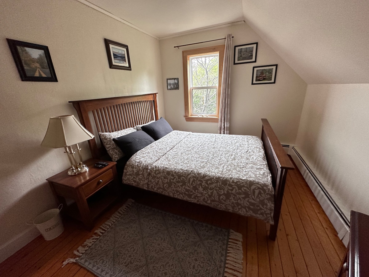 The Orchard Bedroom and Bathroom overlook the rear yard full of apple trees and partially visible is the Cape Breton Highlands. Located in the heart of Cape Breton directly off of the Cabot Trail. This bedroom is within a 2700 square foot century home full of old charm and uniquely decorated. You will enjoy your private bathroom with a skylight and rain shower head. You will have access to a common sitting area with a piano and coffee maker/kettle and a shared main floor bathroom.