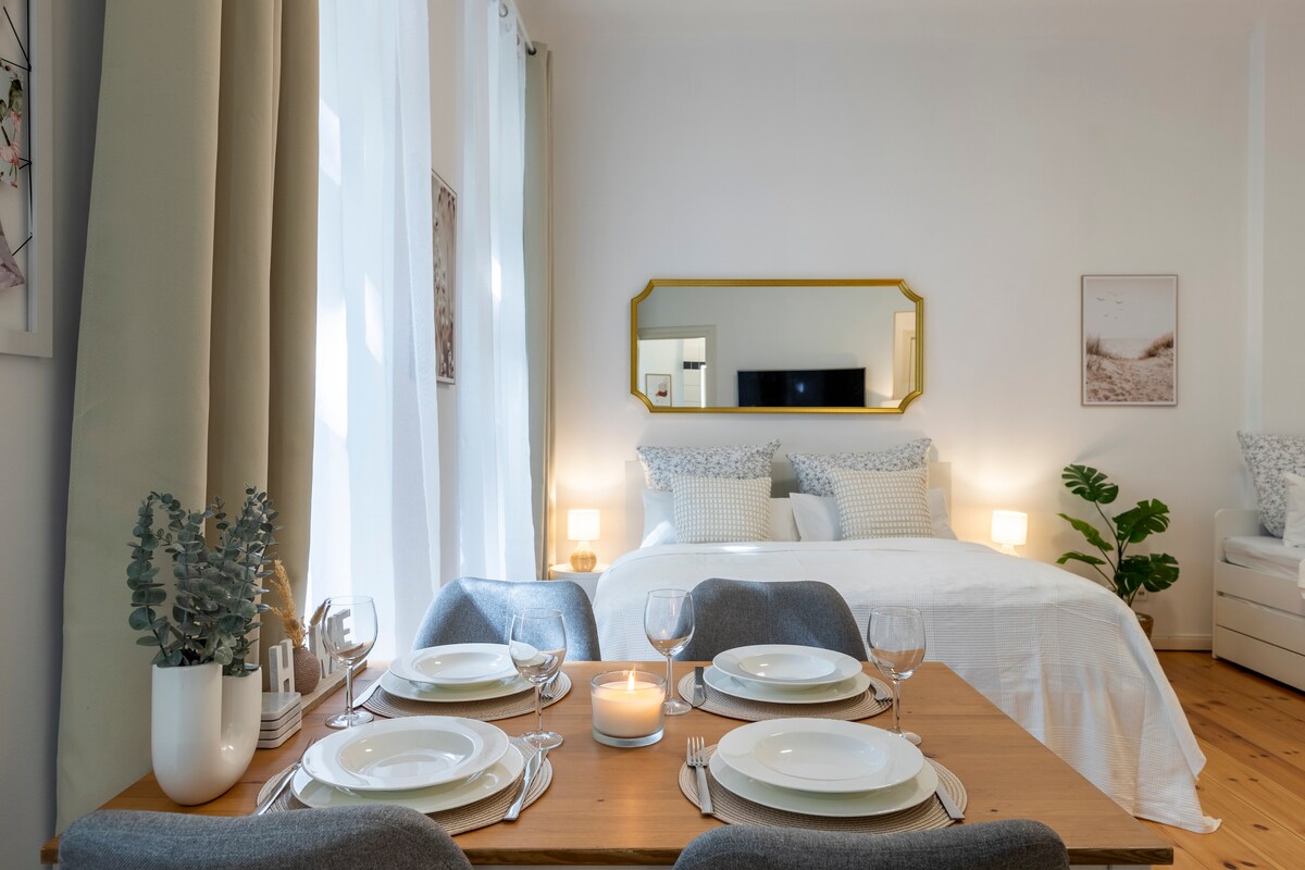 Mans dzīvoklis atrodas modernajā "Prenzlauer Berg" apkaimē. Dzīvoklis atrodas 1. stāvā (Amer. 2.), ar skatu uz klusu iekšpagalmu, labi apgaismots pa diviem lieliem franču logiem. Skats ietver atjaunotu rūpnīcu un studijas tipa dzīvokli. Studijas tipa dzīvokļa platība ir 40 kvadrātmetri, tajā ir divguļamā gulta, minivirtuve, kurā ir viss atpūtai un ēdiena gatavošanai. Studijas tipa dzīvoklī ir grezns gaitenis un luksusa vannasistaba, kurā ir duša un vanna, kā arī grīdas grīda. Viss dzīvoklis ir 60 kvadrātmetrus liels un gaumīgi iekārtots, apvienojot modernās un klasiskā dizaina piezīmes. Ir pieejams ātrs internets. Šī apkaime ir ļoti patīkama un viena no jaunākajām Berlīnē. Maiznīcas, kafejnīcas, velosipēdu noma, publiskie parki un lielveikals atrodas pavisam netālu. Pasaulē pazīstamais "Mauerpark" ar tā daudzajām atrakcijām un tirgu (nedēļas nogalēs) atrodas 15 minūšu brauciena attālumā ar velosipēdu. Iela ir klusa, atrodas starp diviem lieliem bulvāriem, ar fantastisku sabiedrisko transportu uz ariportiem, kā arī citiem centrālajiem apskates objektiem un kvartāliem, piemēram, Aleksandra laukumu, East Side Gallery, Mitte, Friedrichshain u.c. Varat doties uz Kastanienallee und Alte Schönhauser Allee, diviem stilīgiem iepirkšanās bulvāriem. Šeit dzīvo daudz jaunu cilvēku, esmu pārliecināta, ka jums tas patiks!