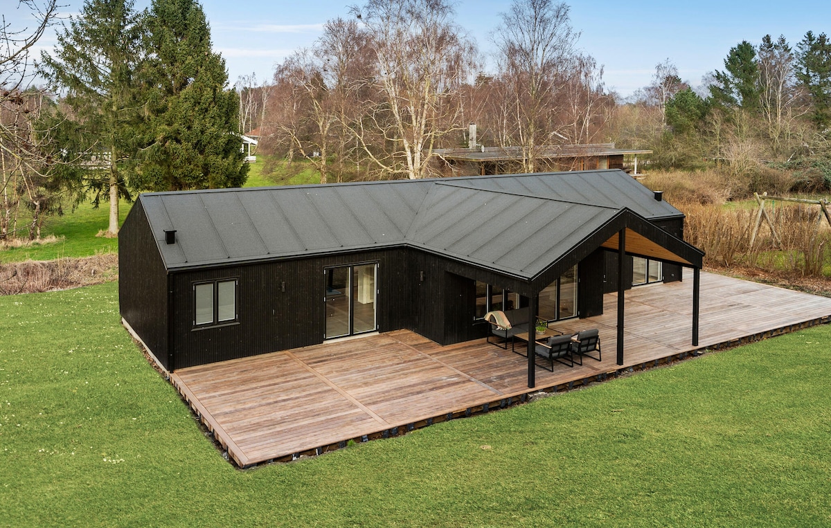 128 m2 vasarnīca pirmajā rindā, 30 metru attālumā no skaistas privātas un mierīgas pludmales. Mājas aizmugurē atrodas jauna privāta āra vanna un duša, kas iebūvēta terasē. Māja atrodas lielā zemes gabalā ar mežu, kas ir ideāli piemērots rotaļām un piedzīvojumiem. 15 minūšu brauciena attālumā atrodas Stege ar veikaliem un restorāniem, bet 3 km gājiena attālumā ir Klintholmas ostas pilsēta. Optimāla vieta jūras foreļu zvejai. Pastaigu taka "Camønoen" atrodas tieši blakus. Māja ir moderni iekārtota un tajā var izmitināt līdz 8 personām.