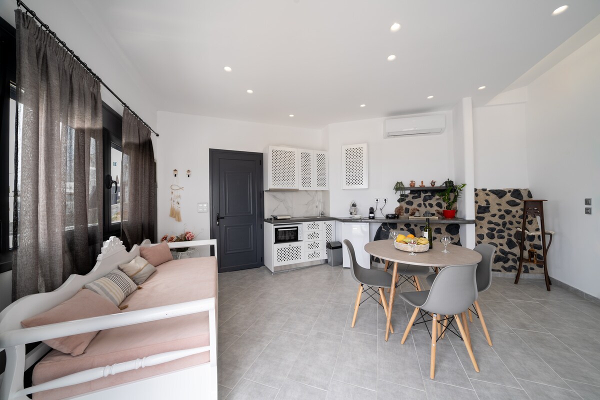 Mirabo Villa homonīmajā apartamentā, kas iebūvēts maisonette stilā, ir divas atšķirīgas guļamistabas ar divguļamajām gultām, tāpēc tas ir ideāli piemērots ģimenēm, draugu grupai un medusmēnešiem, kuri vēlas baudīt brīvdienas ļoti ērtā un relaksējošā veidā. Abas atsevišķās un plašās vannasistabas ir skaisti iekārtotas, un viesistaba piedāvā stundām ilgu atpūtu . Otrajā stāvā varat baudīt skatu uz kalderu un vulkānu un saulrietu no privātā balkona.