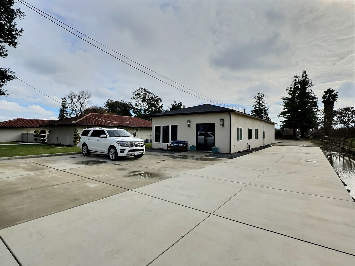 Mājīgs mājoklis ar jauku pagalmu. Ideāli piemērots klusam vakaram, baudot vīnu pie ugunskura, kamēr jūs varat dzirdēt ūdens skaņu dīķī. Lieliski piemērots pāru atpūtai vai ģimenēm, kas ceļo. Mēs esam tuvu visam...5 minūtes līdz 99. automaģistrālei un aptuveni 10 minūtes līdz Modesto centram. Mēs atrodamies 20 minūšu attālumā no Turlokas un 15 minūšu attālumā no Mantekas. Pastaigas attālumā līdz Save Mart tirdzniecības centram, restorāniem utt. Mums ir dārznieks, kas ierodas ceturtdienu rītos un pļāpā priekšā un pagalmā