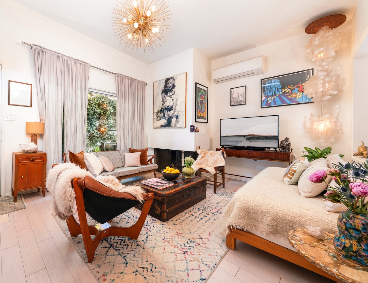 Harizmātisks, māksliniecisks gadsimta vidus mājoklis, iekārtots kalna nogāzē, atrodas kanjona sirdī. "Skaisti iekārtots, nevainojami tīrs un fenomenālā vietā." ❤️ ★ Privāta āra terase un lekns apstādījums ★ Ēdienreizes ārā ar skatu uz kanjonu ★ Pilnībā aprīkota virtuve ★ Kafija, kāda tai jābūt: espreso, filtrēta un Nespresso ★ Autostāvvieta → nosegta autostāvvieta (1 automašīna) ★ 50 collu Smart TV ar Netflix ★ Marshall skaņas sistēma ★ Ātrs Wi-Fi + darba vieta 6 min. → Beverlihilsa un UCLA 20 min.→, LAX ✈
