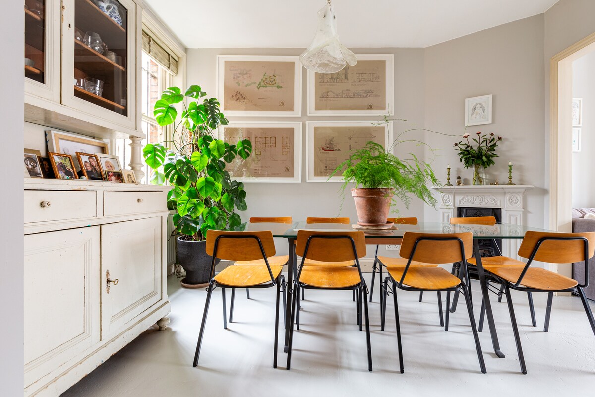 Our Home: This elegant Georgian townhouse, spread across three storeys, is rich in character and charm. The modern kitchen extension adds a contemporary touch, making our home the perfect setting for a cosy getaway. Inside, you'll find an abundance of greenery, while the large garden outside offers a spacious retreat. Our Neighbourhood: Nestled in the heart of De Beauvoir Town, a charming enclave in central London within the borough of Hackney, a short 20-30 minute journey to central London.