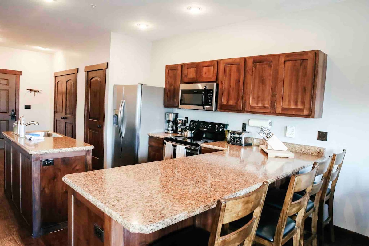 Šis 2. stāva dzīvoklis, kas atrodas pašā Vaitfišas centrā, 300 kvartālā pašā Vaitfišas centrā, uzņem viesus ar modernu kalnu raksturu un mājīgu noskaņu! Ērtību klāstā ietilpst 2 gultas, 2 vannasistabas, ēdamistabas bārs ārpus virtuves, nerūsējošā tērauda ierīces, gāzes kamīns un 1 pazemes autostāvvieta. Iekārtojieties un baudiet grāmatu un kafiju blakus gāzes kamīnam vai kokteili uz terases, baudot skatu uz pilsētas centru un Lielo kalnu!