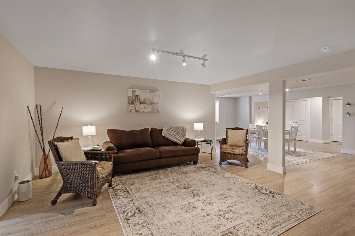 Izbaudiet privātu ieeju šajā mājīgajā dienas gaismas pagraba studijā netālu no pastaigu takām un Mazās Spokanas upes, tikai 5 minūšu attālumā no iepirkšanās un vakariņām. Iekšpusē atradīsiet luksusa vinila dēļu grīdas, stilīgu palešu sienu un svaigu krāsu. Viegli atpūtieties uz LABĀKĀS divguļamās gultas (viesi par to priecājas!) vai IKEA karalienes izvelkamajā mājoklī, kas ir ideāli piemērots bērniem vai papildu viesiem. Papildērtības ietver Wi-Fi, Roku TV un DVD atskaņotāju ar filmām. Vai ceļojat ar RV vai treileri? Pieejama paplašināta autostāvvieta!