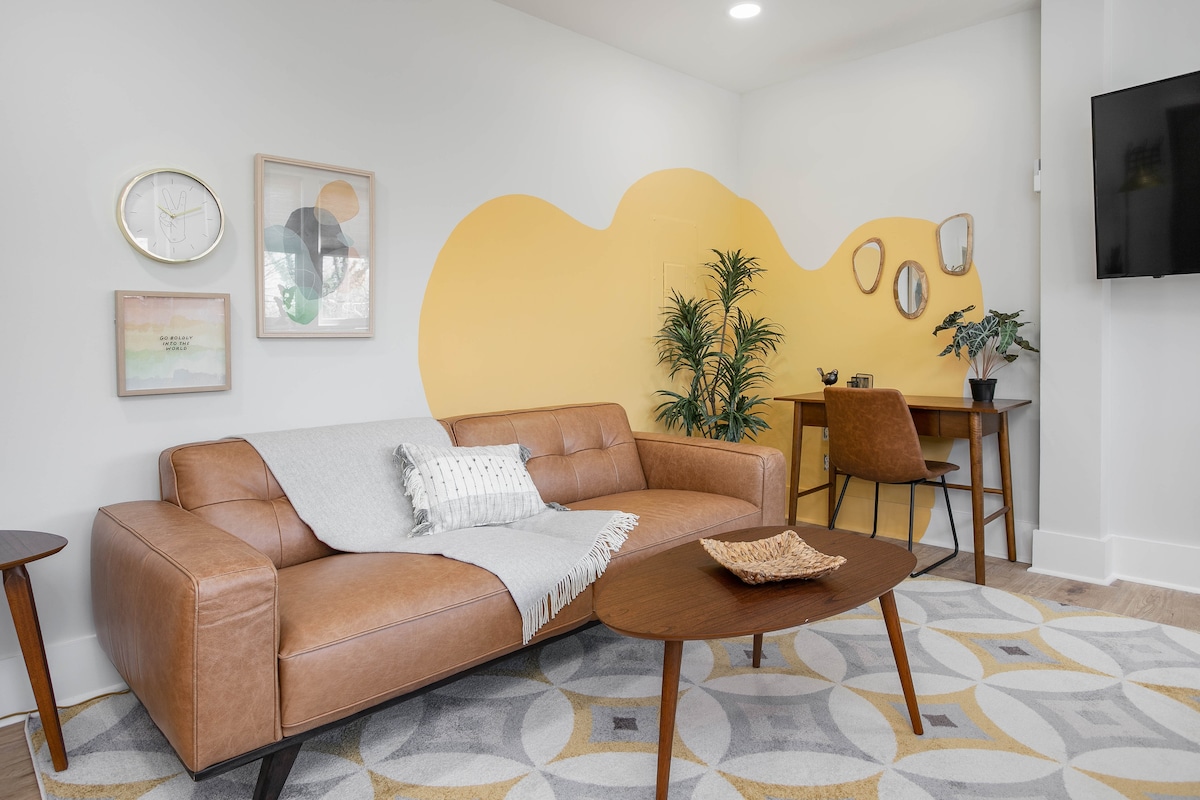 SUMMIT @ West End, kas atrodas Vinstonas-Salemas CENTRĀ, pastaigas attālumā atrodas nebeidzami restorāni, bāri, veikali un izklaides vietas! Atpūtieties mūsu pilnībā atjaunotajā telpā, kas veidota, domājot par komfortu un radošumu. Izbaudiet autostāvvietu un veļas mazgātavu uz vietas, luksusa kafijas/tējas staciju, augstākās kvalitātes "king" matraci un gultasveļu, viedos televizorus viesistabā un guļamistabā, ātrdarbīgu Wi-Fi un daudz ko citu! 3 min līdz Tūkstošgades centram 5 min līdz Wake Forest Baptist Health 7 min līdz LJVM 8 min līdz Novant Health 8 min līdz WFU