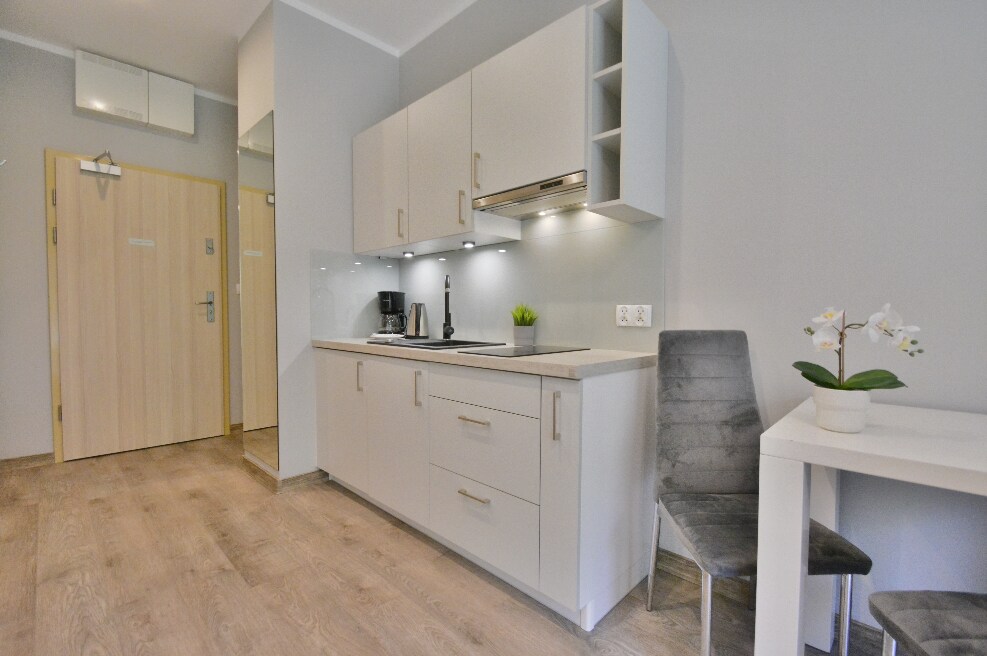 Moderns studijas tipa dzīvoklis (31 m²) Platan Complex 13. stāvā Svinouiscē. Brīnišķīgs skats uz jūru un pilsētas panorāmu, gaišs interjers, ko iedvesmojusi pludmale un saule. Pilnībā aprīkota virtuvīte, liela gulta, izvelkams dīvāns, eleganta vannasistaba. Tikai dažu minūšu gājiena attālumā no pludmales un promenādes, netālu no restorāniem, veikaliem un UBB vilciena. Ideāla vieta romantiskai atpūtai vai relaksējošai nedēļas nogalei Baltijas jūras krastā.