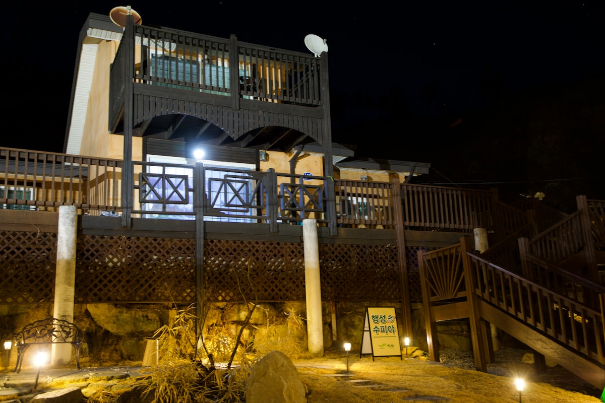 Vai meklējat ceļojumu☆ divām ģimenēm? Pamata izmitināšana 8 personām (individuāli pieprasījumi par pārpalikumu) 3 istabas, 2 vannasistabas, 2 dzīvojamās istabas Plašā divstāvu jaunā vienģimenes mājā Gūstiet mierīgas un īpašas atmiņas kopā ar ģimeni! ☆Atļauti mīļdzīvnieki (papildu uzkopšanas maksa○) & Pilnībā aprīkots ar grila iekārtām ziemas/lietus sezonā! #Jauna konstrukcija#Grils#Autostāvvieta 3 vai vairāk automašīnām#Kamīns#Ugunskura vieta# Pieejamība # Mājdzīvnieki # Kultūraugu piedzīvojums#Mini peldbaseins (tikai no jūlija līdz augustam) "Hoengseong Pension Sunshine Village"