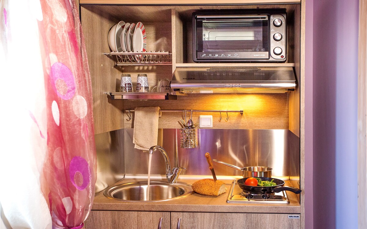 Laipni lūdzam mūsu pilnībā atjaunotajā studijā, kur tā tika pabeigta 24. janvārī. Moderna telpa ar pilnībā aprīkotu virtuvi, ērtu gultu un greznu vannasistabu ar detalizētu dušu. Privāts balkons brokastu kafijas baudīšanai. Naktsmītne atrodas 5 minūšu gājiena attālumā no pilsētas centra, 200 metru attālumā atrodas lielas zināmas ķēdes lielveikals. Mēs ar nepacietību gaidām jūsu uzņemšanu un mūsu piedzīvojumu tuvplānā,cerot, ka tas liks jums atgriezties nākotnē.