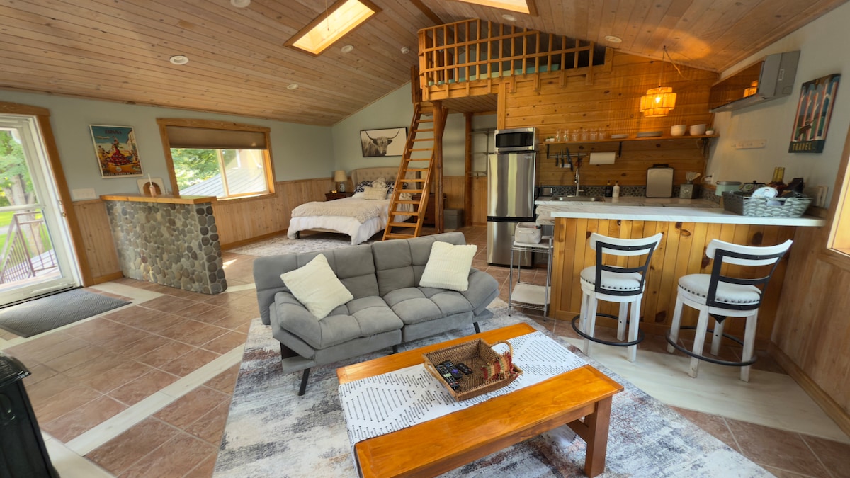 Aizbēdziet uz elegantu 2 gultu, 6 personu studiju ar labi aprīkotu virtuvīti, ēdamzonu, s 'mores komplektu un cepumiem. Atpūtieties uz ērta dīvāna viesistabas zonā ar Roku TV vai atpūtas telpu iekštelpu šūpuļtīkla krēslā. Ar Bali iedvesmoto vannasistabu ir plaša akmens duša diviem. Ārā baudiet ugunskura vietu, mini golfa laukumu un kukurūzas caurumu. Nepieciešama automašīna? Vai vēlaties uzzināt par mūsu 2023 Tesla Model 3 nomu.
