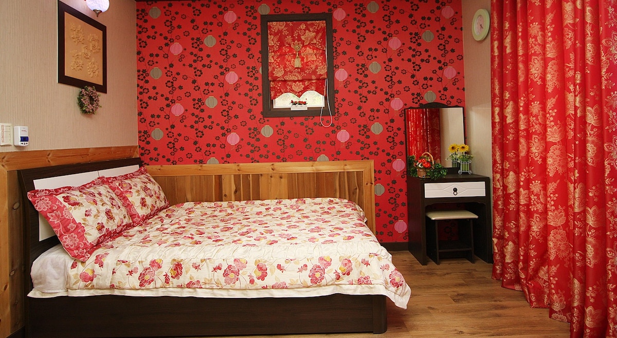 강렬한 붉은색의 인테리어 조합으로 화려한 느낌의 커플 객실