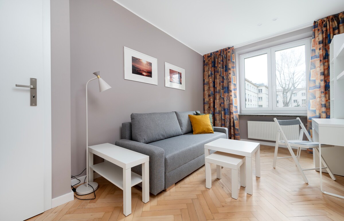Pilnībā aprīkots studijas tipa dzīvoklis. Augsts standarts. Sienas rotā augstas klases, dizaineru tapetes. Dzīvoklis ir nesen izremontēts. Bezmaksas pazemes autostāvvieta. Tuvumā: 1. 3 minūšu gājiena attālumā atrodas Veselības parks. 2. 15 minūšu gājiena attālumā atrodas Orientarium parks, Lodzas zooloģiskais dārzs, skaistais botāniskais dārzs un viens no lielākajiem ūdens parkiem “Aqua Park Fala” 3. 5 minūtes ar automašīnu vai 30 minūšu gājiena attālumā no Atlas Arena - koncertu un kultūras pasākumu vieta. 4. 5 minūtes ar automašīnu Manufaktura