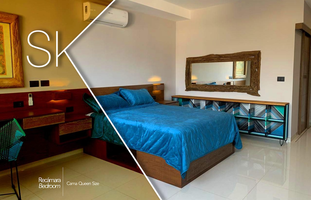 Lielisks dzīvoklis jaunajā AMBAR tornī, kas atrodas divu kvartālu attālumā no Puertovaljartas jahtu piestātnes/ostas termināļa. Puertovaljartas viesnīcas centrā. Alberca un džakuzi ar panorāmas skatu uz līci, bezmaksas piekļuvi pludmalei līdz vienai ielai, mazāk nekā 10 minūšu gājiena attālumā no "La Isla Shopping Village" pussalas un galerijām Vallarta. 1. istaba: King izmēra gulta, viena dīvāngulta KS, 1 pilnībā aprīkota vannasistaba, visaptveroša virtuve, Wi-Fi, SmartTV un gaisa kondicionētājs.